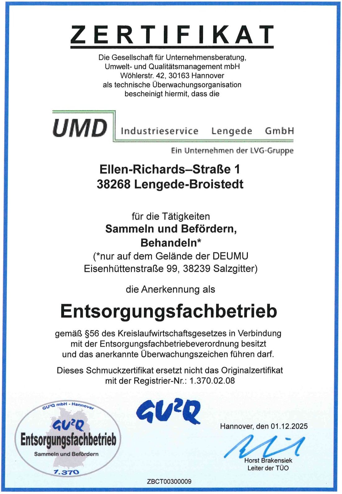 Mit diesem Zertifikat wird bestätigt, dass unser Unternehmen die gesetzlichen und fachlichen Anforderungen für eine sichere und umweltgerechte Entsorgung von Abfällen erfüllt.