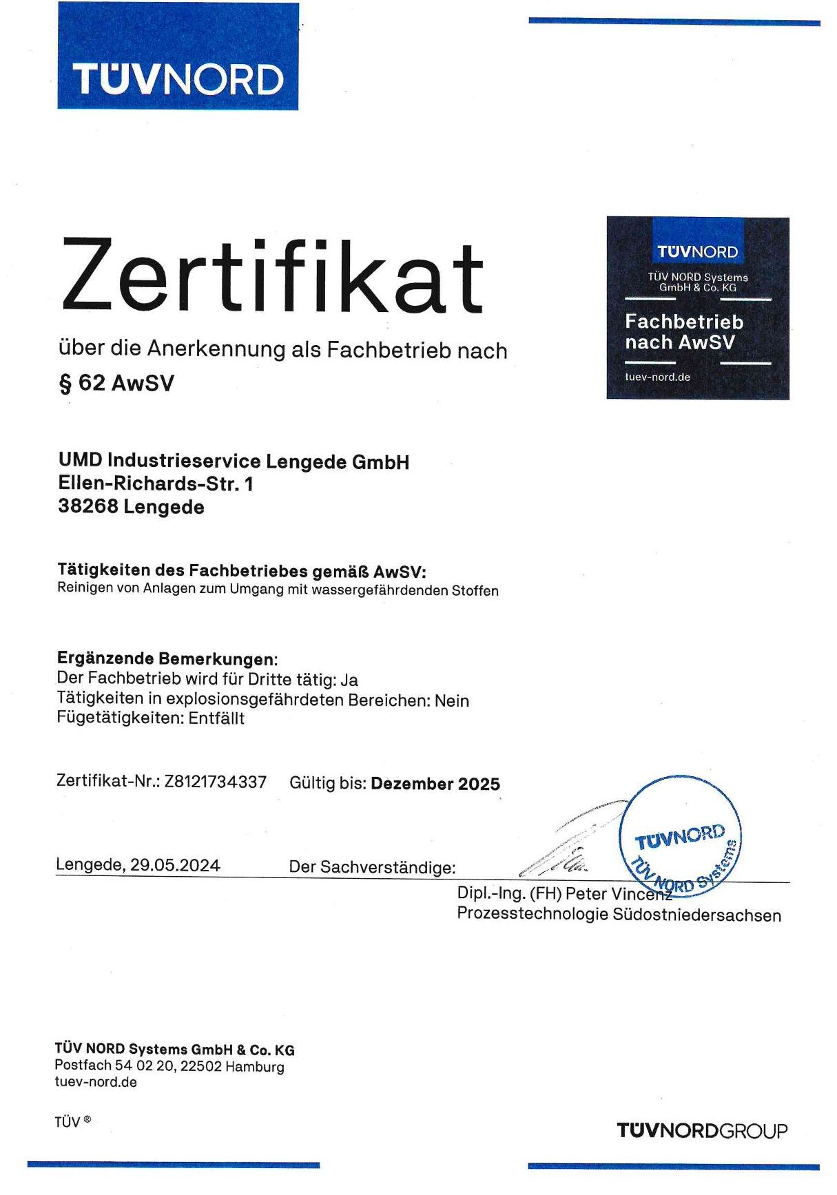 Die Firma UMD Industrieservice Lengede GmbH ist als WHG Fachbetrieb gemäß Anforderungen des Wasserhaushaltsgesetzes (WHG) und der Verordnung über Anlagen zum Umgang mit wassergefährdenden Stoffen (AwSV) anerkannt. Der Betrieb ist qualifiziert mit wassergefährdenden Stoffen sicher umzugehen und schützt somit Gewässer vor Verunreinigungen.